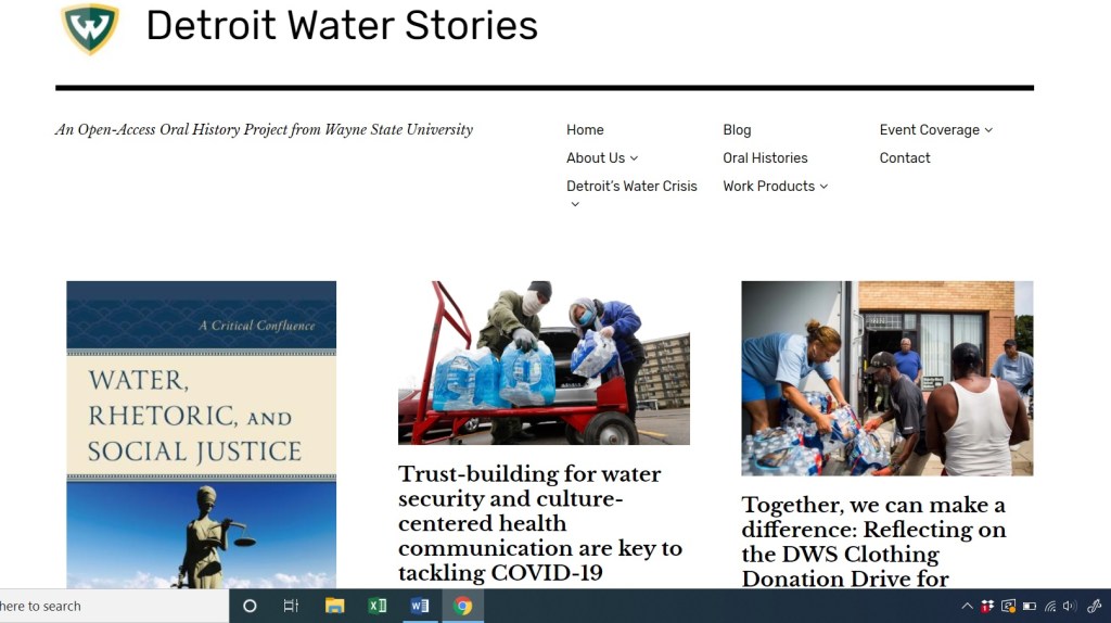 Funded by grants from Wayne State University’s Research Enhancement Program and the Waterhouse Family Institute at Villanova University, the Detroit Water Stories website showcases the work of our 2-year long oral history and ethnography project. The website features a public repository of video and transcripts of oral history interviews with community organizers and other key stakeholders of Detroit’s water insecurity crisis. In addition, the website features various community resources, a background of the water crisis, blog posts by members of the research team and from among our community partners, scholarly products, community-centered creative products, and video footage of various community events. This material has been donated to the Walter P. Reuther Library at Wayne State University.