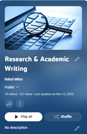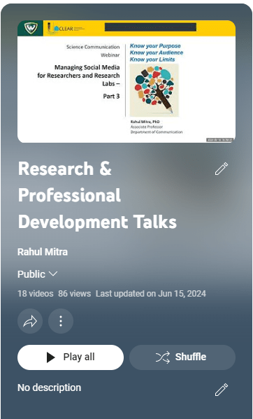 I developed two video playlists on my YouTube channel on research writing and professional development in graduate school. The research writing playlist goes over different aspects and sections of an academic paper in the Communication discipline. The professional development playlist addresses topics such as managing social media for research labs, and preparing for nonacademic careers post-PhD.